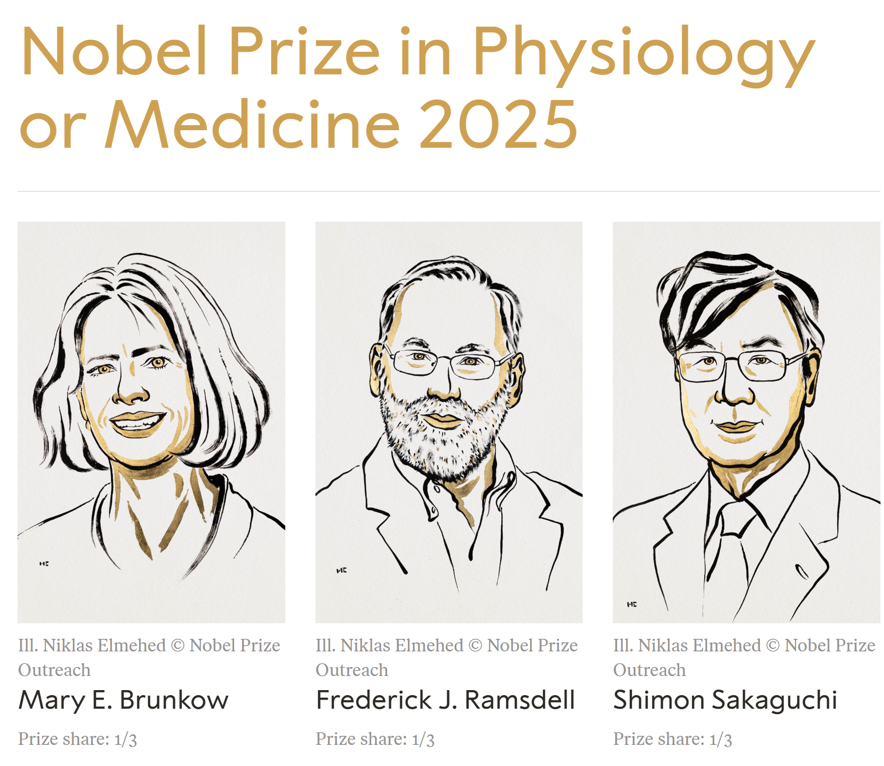 2025 年 10 月 6 日当地时间,瑞典卡罗琳斯卡医学院宣布,将 2025 年诺贝尔生理学或医学奖授予 Mary E. Brunkow、Fred Ramsdell 与坂口志文(Shimon Sakaguchi),以表彰他们在“外周免疫耐受机制”方面的开创性发现。这一发现揭示了免疫系统保持平衡、防止自身攻击的关键—— 调节性 T 细胞(Regulatory T cells, Tregs)。