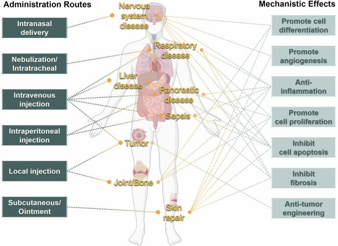 截至 2025 年,全球已有超过 100 项临床研究评估 EV 药物在呼吸系统、神经系统、肿瘤及急性炎症性疾病中的疗效。文章重点概述了几大疾病领域的突破:(1)呼吸系统疾病:MSC-EVs 通过调控多种信号通路(如 PI3K/Akt、Nrf2、NF-κB 等),能抑制炎症、减少细胞凋亡、促进肺组织修复,已在急性肺损伤、特发性肺纤维化、哮喘及 COVID-19 相关 ARDS 模型中显示疗效。(2)神经系统疾病:EV 药物可促进神经元存活与再生,在脑卒中、脊髓损伤、阿尔茨海默病等中枢神经疾病中具有显著保护作用。工程化 EV 可通过特定肽段实现血脑屏障穿透,为神经退行性疾病治疗开辟新路径。(3)急性炎症与器官衰竭:MSC-EVs 可通过 lncRNA H19 或 miR-17 等分子机制调控免疫反应,缓解急性肝衰竭和胰腺炎。部分经靶向修饰的胎盘来源 EV 在动物模型中表现出显著疗效。(4)肿瘤治疗:免疫细胞来源 EV(如树突状细胞或 NK 细胞 EV)能增强抗肿瘤免疫;而工程化 EV 可装载化疗药或 siRNA,靶向递送至肿瘤细胞,减少系统毒性。例如,负载多柔比星的磁性 EV 在外场引导下实现精准肿瘤定位与局部热疗释放。